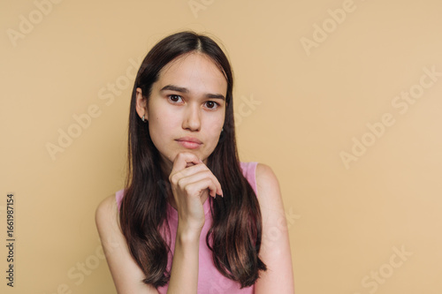 Young woman with long hair in a thoughtful pose against a beige background.