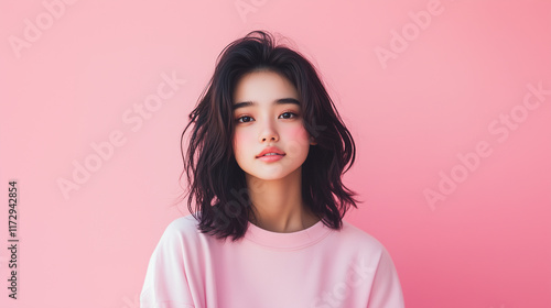 woman, young, trendy, lifestyle, asian, sweater, portrait, korean, chinese, japanese, gorgeous, beautiful, make-up, skincare, care, person, positive, lady, model, hair, wavy, pink, background, beauty, casual attire, fashion, expressive, smiling, natural, style, youth, confidence, soft, aesthetic, feminine, relaxed, cheerful, closeup, studio, vibrant, fresh, playful, elegant, serene, charming, artistic, modern, youthful