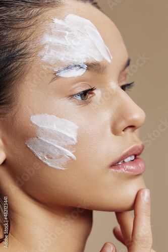 young woman with moisturizer on the cheeks in the eye area beige background