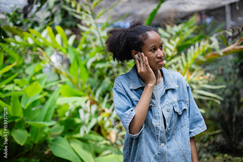 woman, earphones, denim, jacket, natural, hair, garden, green, plant, music, casual attire, relaxation, young, adult, nature, foliage, portrait, leisure, lifestyle, happiness, summer, peaceful, thoughtful, standing, single, person, beauty, fresh, air, environment, tropical, enjoyment, youth, female, wear, earphones, listening, calm, serene, tranquil, day, sunlight, greenery, smiling
