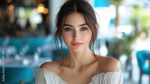 missy, natural makeup, female, adult, brunette, indoor, daytime, portrait, casual attire, beauty, serene, relaxed, dining, blouse, hair, smile, elegant, atmosphere, decorative, charming, lifestyle, leisure, ambient, blue, sharpened, lighting, soft, background, cafes, peaceful, feminine, gaze, stylish, confident, modern, fashion, social, trendy, artistic, food, table, appealing, sitting, cultural, reflective
