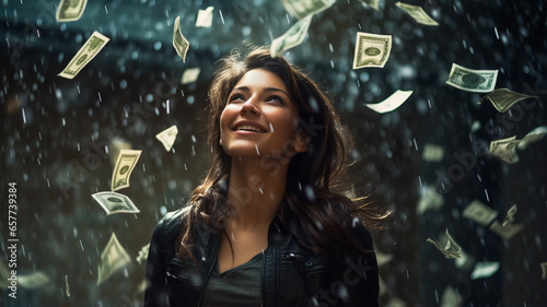 young woman with rain falling from dollar bills