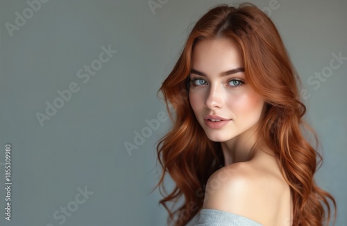 Young woman with red hair, blue eyes poses against neutral gray background. Skin looks clear, healthy, with subtle makeup. Looking over shoulder with soft expression. Image suitable for beauty,