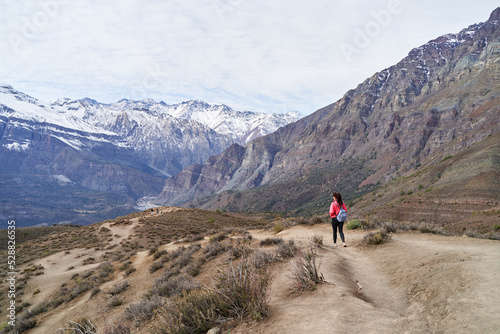 young woman with red jacket and backpack, descending the mountain in the middle of the Andes Mountains of Chile
