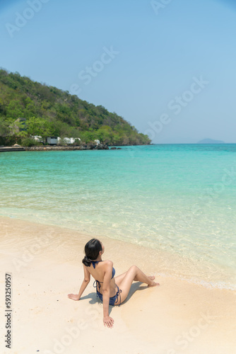 Young woman with sexy bikini on the beach to relax and sunbathe at sea on holiday in Thailand island