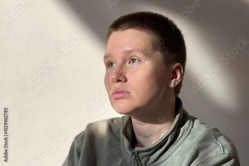 young woman with short hair, feminist sad, depressed, in sunny weather, at home, portrait