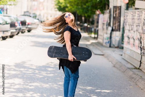 YOUNG WOMAN WITH SKATING BOARD ON URBAN PLACE