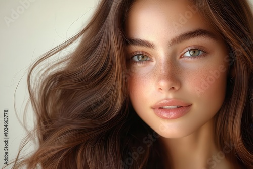 young woman with sleek shiny brown hair cascading down her shoulders emphasizing beauty and hair care soft lighting highlights the smooth texture conveying a sense of elegance and vitality