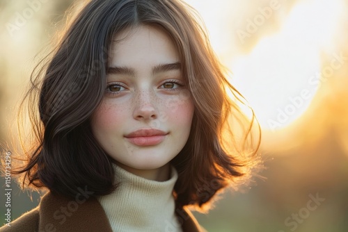 Young woman with soft features and glowing skin enjoying a sunset outdoors