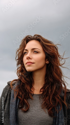 Young Woman with Wavy Hair Gazing Thoughtfully at Overcast Sky