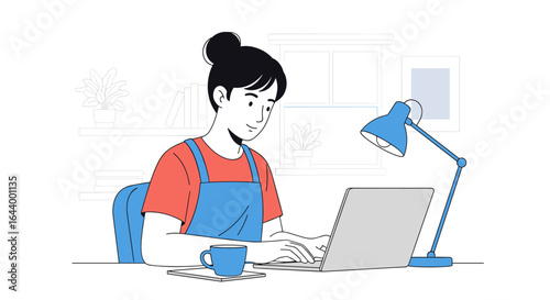 woman, working, laptop, computer, desk, hot drink, cup, home office, online, education, study, learning, typing, focused, concentration, interior, illustration, drawing, vector, graphic, design, person, female, young adult, adult, casual attire, attire, red shirt, workspace, modern, clean, minimalist, background, bookshelf, lamp, plant, productive, tied-up