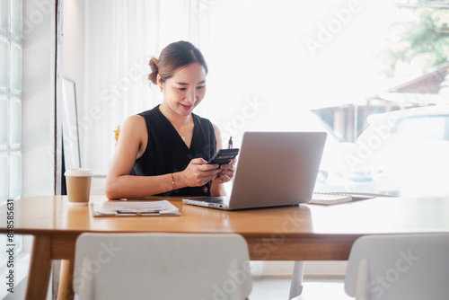 Young woman working from home using laptop and smartphone, seated at a wooden table with coffee and documents in a bright, modern home office.