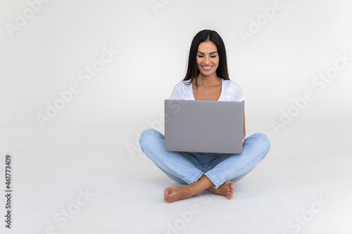 woman, laptop, floor, young, background, casual attire, white, female, sitting, smile, studio, technology, isolated, girl, happy, people, working, computer, cyberspace, person, web, tech, web, net, latin, joyful, hispanic, content, cheerful