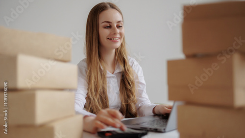 Young woman working on a laptop surrounded by cardboard boxes in a modern office space during the day