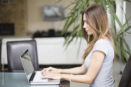 woman, lifestyle, wireless, laptop, female, home, notebook, technology, caucasian, casual attire, computer, communication, young, house, cyberspace, relaxation, indoor, modern, life, person, girl, room, apartment, leisure, living, typing, using, network, comfortable, adult, pretty, looking, connection