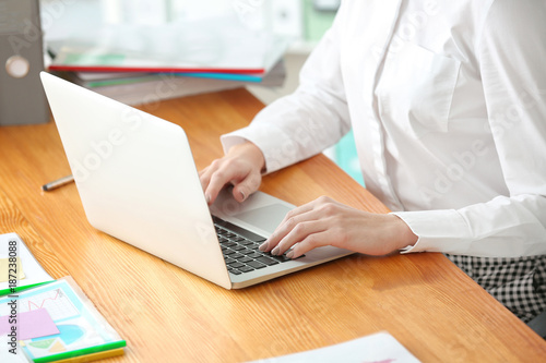 Young woman working with laptop in office, closeup