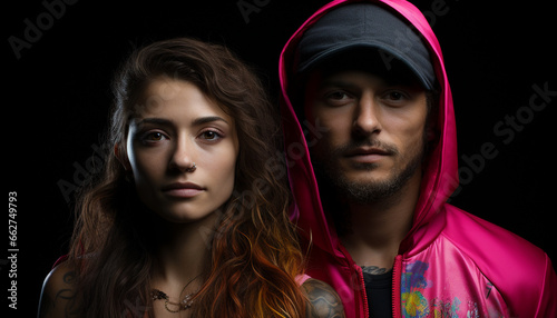 Young women and men, beauty and fashion, looking at camera generated by AI
