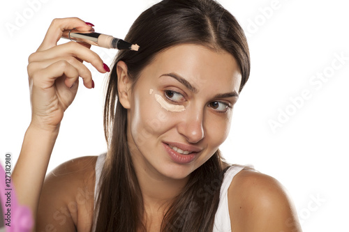 young women applied concealer under the eyes with applicator