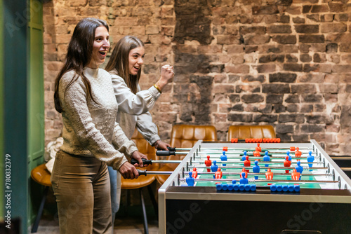 Young women enjoying a game of table soccer