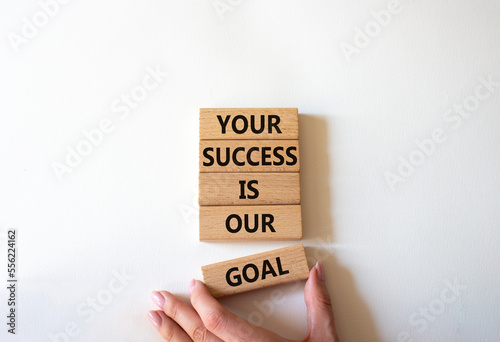 Your success is our goal symbol. Wooden blocks with words Your success is our goal. Beautiful white background. Businessman hand. Business and Your success is our goal concept. Copy space