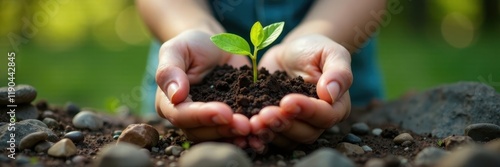 Youthful hands cradling vibrant plant sprouting from rocks , shadow, new