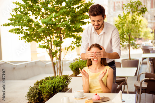 Yummy morning. Surprise for honey from her lover, in light cafe on a sunny day, of coffee with tasies, great brunch