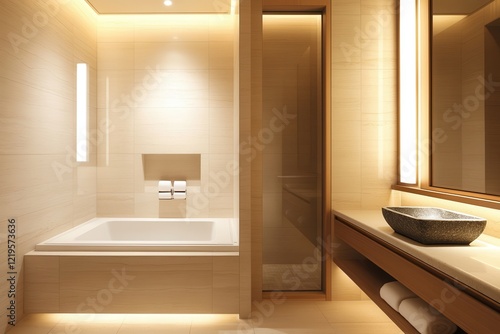 Zen interior design: Minimalist balance in open spaces. Modern bathroom with minimalist design and warm lighting.
