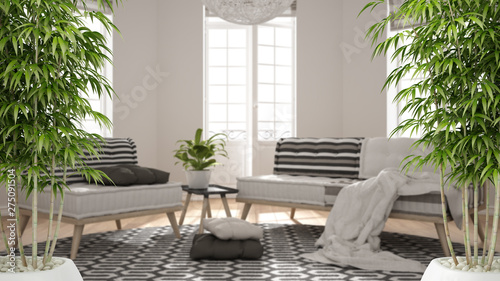 Zen interior with potted bamboo plant, natural interior design concept, scandinavian minimalist living room with big windows and carpet, contemporary modern architecture concept idea