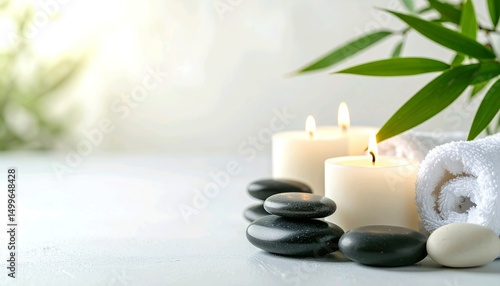Zen Spa Still Life with White Candles, Black Stones, Rolled Towels and Green Leaves on White Background