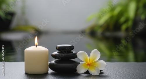 candle, frangipani, flower, still life, spa, wellness, zen, massage, therapy, relaxation, calmness, peace, calm, meditation, aromatherapy, balance, healing, serenity, well-being, health, natural, nature, flora, botanical, arrangement, stack, stone, closeup, macro, sharpened, indoor, soft light
