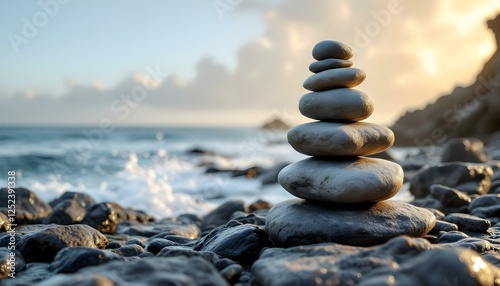 zen, stones, tall, stack, rugged, varied, textures, rocky, cliff, ocean, waves, crashing, sea, spray, misting, sunlight, goldenhour, clouds, background, ultra, highresolution, serene, tranquil,