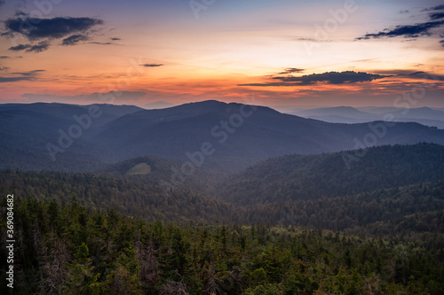 Zmierzch w górach. Gorce ukochane góry Jana Pawła II, Widok z Gorca na zachodzące słońce . Dolina Kamienicy Gorczańskiej