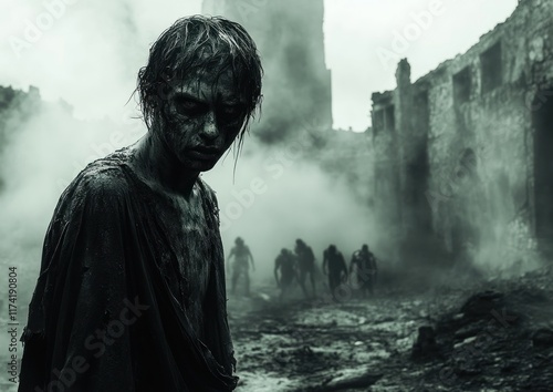 Zombie Apocalypse Horror Scene with Undead Horde and Tattered Figure in Dark Atmosphere