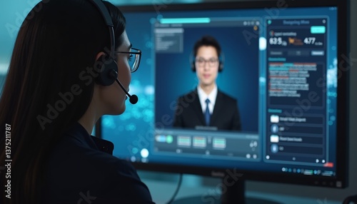zoomed, shot, tech, support, agent, troubleshooting, issue, back, view, ai, generative, business, computer, people, businessman, technology, cyberspace, woman, office, digital, communication, businesswoman, screen, web, success, laptop, team, concept, person, meeting, virtual, work, tablet, finance, montage, group