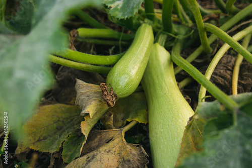 Zucchini in the garden top view, farm products, organic green vegetable marrow growing on bush.
