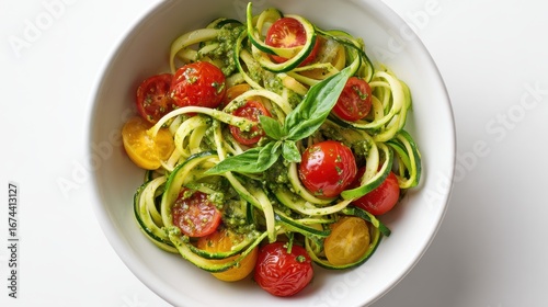Zucchini noodles with pesto and cherry tomatoes in a white bowl