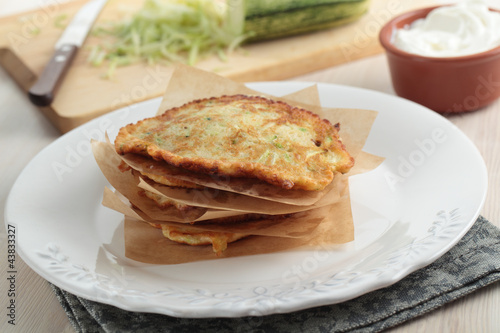 courgette, stack, squash, prepared, food, meal, sour cream, plate, napkin, yellow, green, white, chopping board, vegetable, vegetarian, nobody, horizontal
