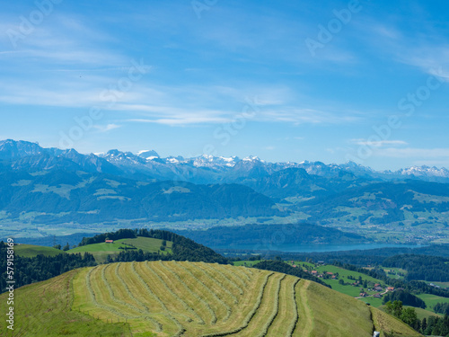 view, zurich, landscape, panorama, agriculture, field, meadow, grass, mow, cut, green, lake, hill, mountain, alps, sight, vista, scenery, countryside, peak, farming, hayrick, hay, height, ridge, mount, highland