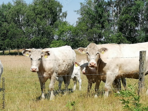 Zwei erwachsene Kühe und ein Kalb schauen in die Kamera.