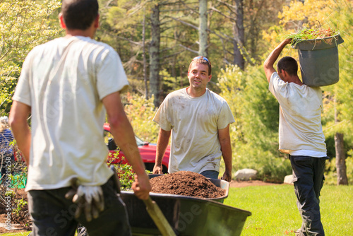 Canvas Prints: Landscapers carrying mulch to a garden in wheelbarrows