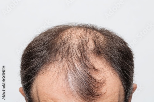 topview, closeup, alopecia, hair, male, human, scalp, bald spot, dermatology, aesthetic, indoor, studio shot, white background