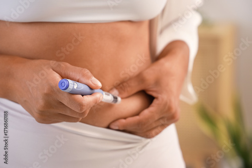 Canvas Prints: Woman injecting herself in bathroom, closeup. Weight loss concept