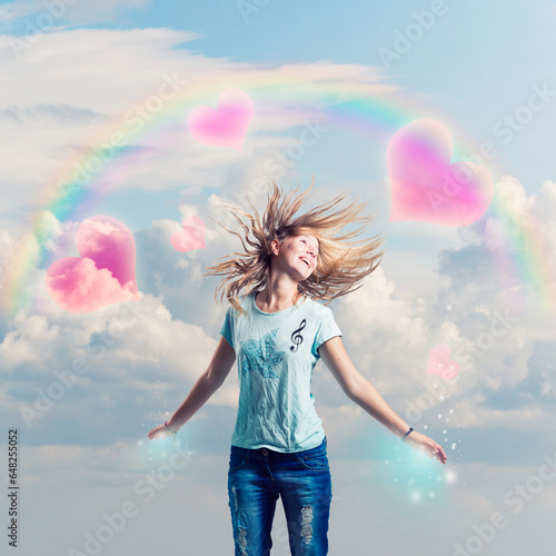fantasy, outdoors, day, magical, dream, joy, imagination, love, happiness, twinkle, rainbow, dreamy, floating, carefree, enjoying, pant, whimsical, wishing, heart, daydreaming, imaginary, long hair, having fun, one person, blue skies, cloud, smiling, colourful, daydreamer, t-shirt, color image, casual clothes, digital imageSHARE