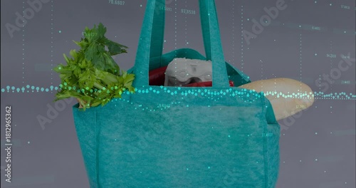 Duvet Covers: Data overlay activating on live feed and shifting over teal tote bag, showing grocery data