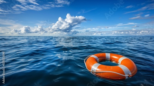 orange, lifebuoy, floating, open, sea, symbol, safety, hope, under, wide, sky, rescue, buoy, water, protection, life, ocean, blue, emergency, secure, horizon, guard, survival, salvage, aid, peace, serenity, calm, support, assistanceSHARE