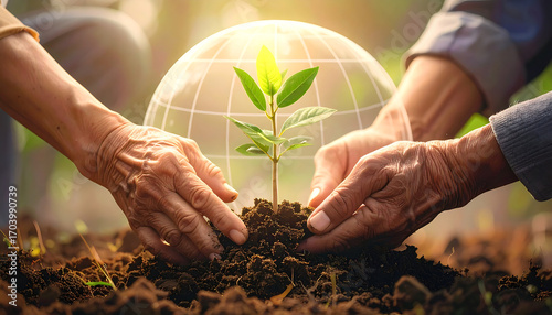 Duvet Covers: Two generations planting a young sapling in fertile soil under a protective globe, symbolizing a green future and environmental conservation