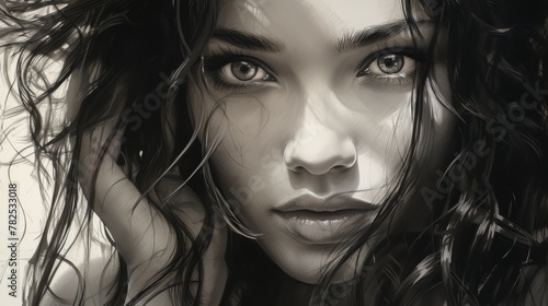 portrait, woman, long, flow, hair, black, white, beautiful, eye, face, picture, detail, goddess, image, serene, classic, profile, fashion, charming, enchant, intense, sensual, realism, greyscale, stunning, radiant, bewitch, lovely, female, stylishSHARE