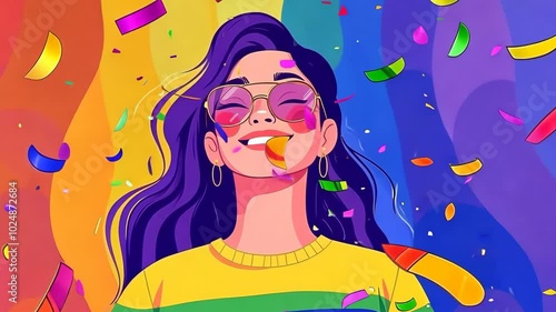 woman, purple, hair, smiling, confetti, rainbow, colourful, stripes, yellow, shirt, happy, celebration, pride, gay, lesbian, transgender, queer, diversity, acceptance, love, community, june, party, festival, parade, joy, freedom, equality, right, support, activism, movement, rainbow flag, rainbow coloursSHARE