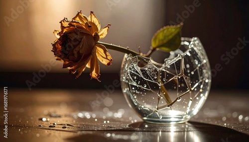 Galaxy Cases: Cinematic photo of wilted flower in cracked glass vase symbolizing fragility loss survival and resilience
