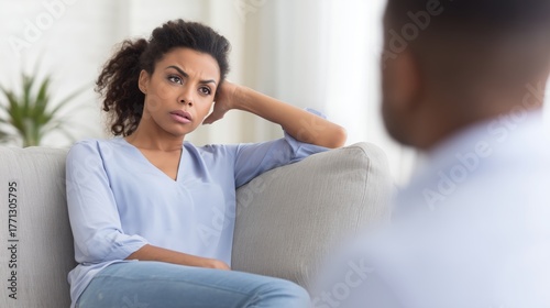 woman, african, american, couch, conversation, emotion, relationship, thoughtful, serious, living room, cosy, engaged, dialogue, expression, intimacy, connection, comfort, atmosphere, discussion, sharpened, body language, interaction, feeling, home, interior, modern, design, decor, light, warmth, ambience, casual attire, relaxed, attention, listening, engagement, personal, space, environment, psychology, therapy, communication, trust, understanding, empathySHARE